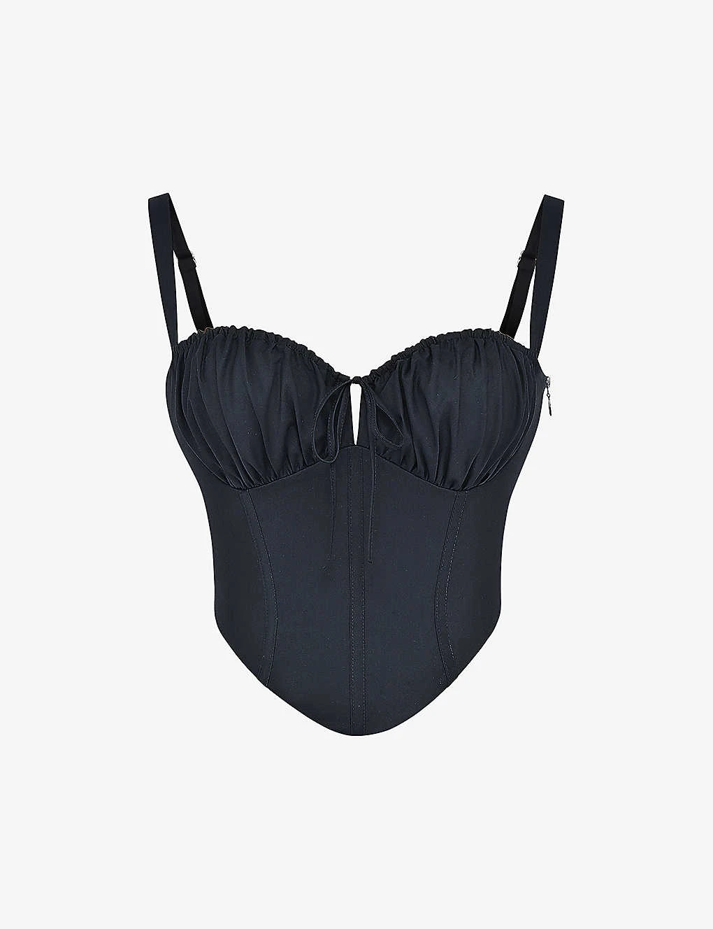 - Adjustable straps, sweetheart neckline, self-tie fastening, fully corseted, tie back, cropped silhouette
