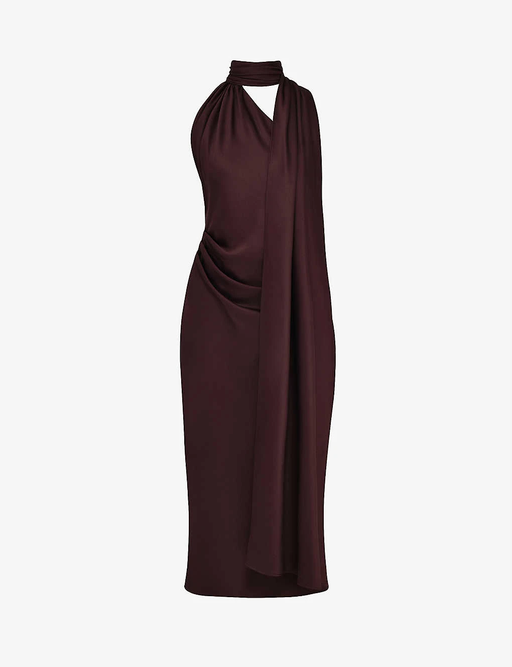 - Wrap neck, sleeveless, asymmetric bodice, midi skirt, open back, adjustable straps at back, cowl back