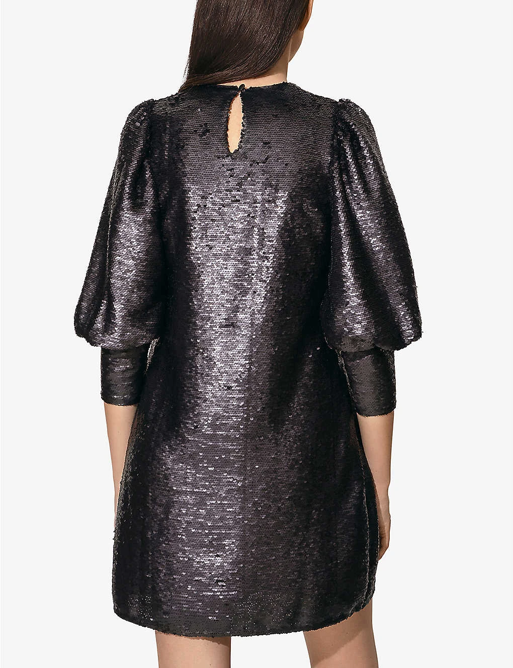 - Round neck, long balloon sleeves, metallic finish, mini length
