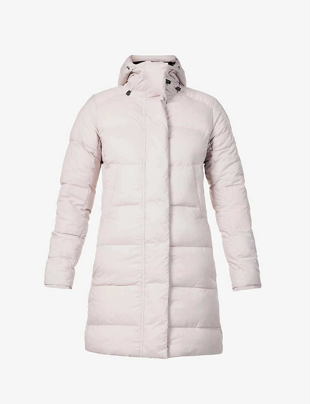 - Drawstring hood, long sleeves, elasticated cuffs, regular-fit, embroidered brand badge at sleeve, two buttoned welt pockets at front, all-over quilted texture and padding, longline, two zip pockets at front, reflective trim at back hood, fully lined