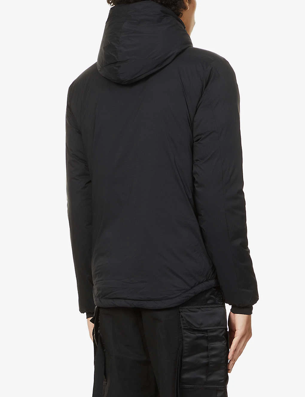 - Drawstring hood, funnel neck, dropped shoulders, long sleeves, brand badge at sleeve, elasticated cuffs , zip-fastening slip pocket at chest, zip-fastening welt pockets at sides, zip pulls, tonal hardware, all-over padded internal pocket, fully lined