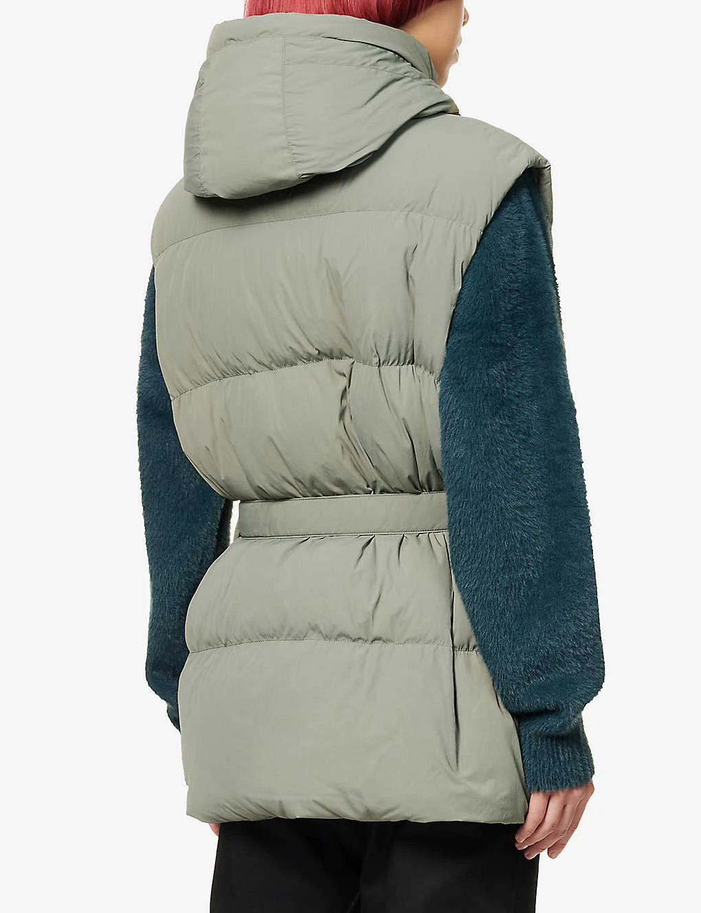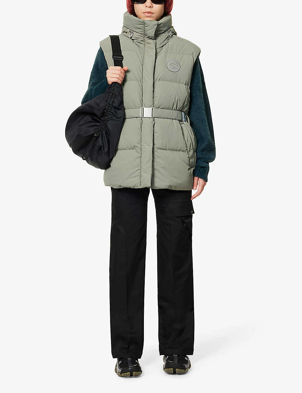 - Regular fit, funnel neck, drawstring hood, sleeveless, tonal brand appliqué at front, two angled pockets at front, belt loops, detachable brand belt at waist, all-over quilted pattern, branded silver-toned hardware