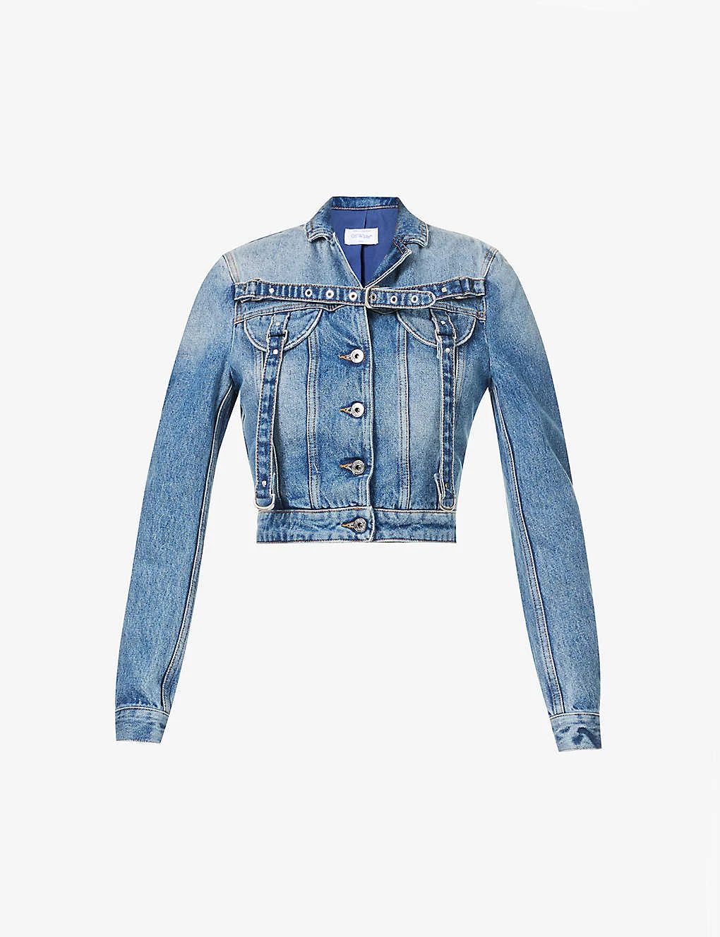 - Regular fit, notched lapels, padded shoulders, long sleeves, buttoned sleeve hems, buckle strap at front, two flap pockets at front, brand patch at back, looped strap with d-ring at back, mid-faded wash, contrast stitching, branded silver-toned hardware, cropped