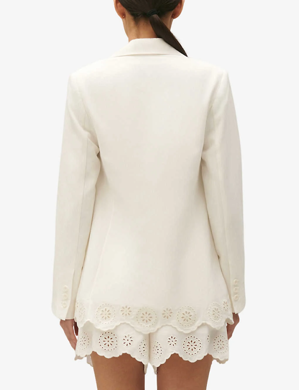 - Single breasted, notched lapels, long sleeves, buttoned cuffs, two flap pockets at front, double vent at back, fully lined, broderie anglaise at scalloped hem