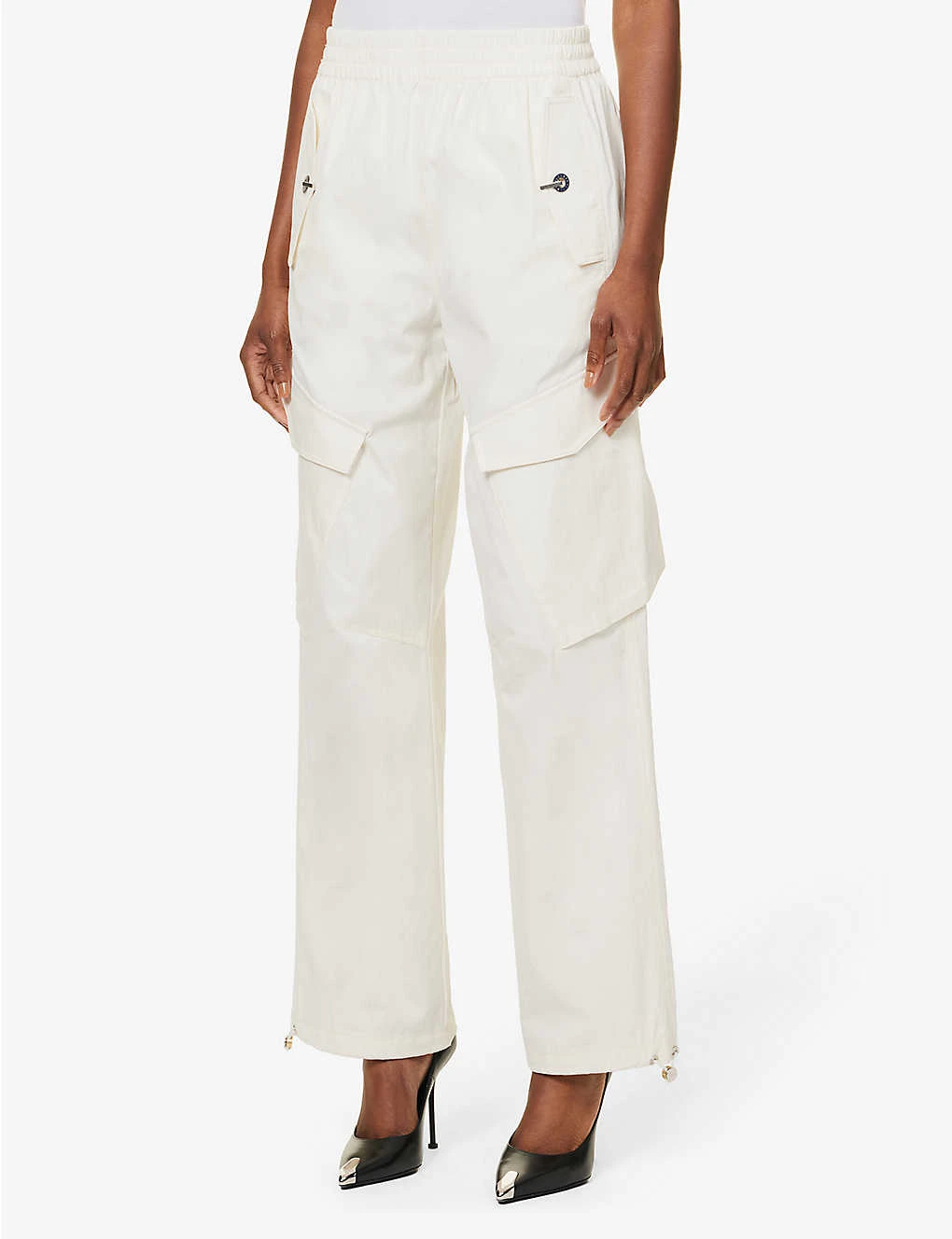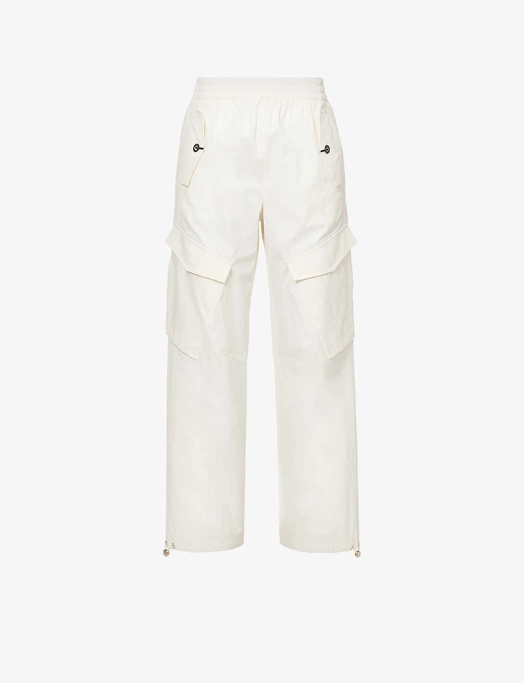 - Relaxed fit, mid-rise, wide leg, structured elasticated waistband, two flap pockets with twist-lock fastening at front, two angled flap pockets at front, two flap pockets at back, contrast stitching, branded silver-toned hardware, drawstring hems