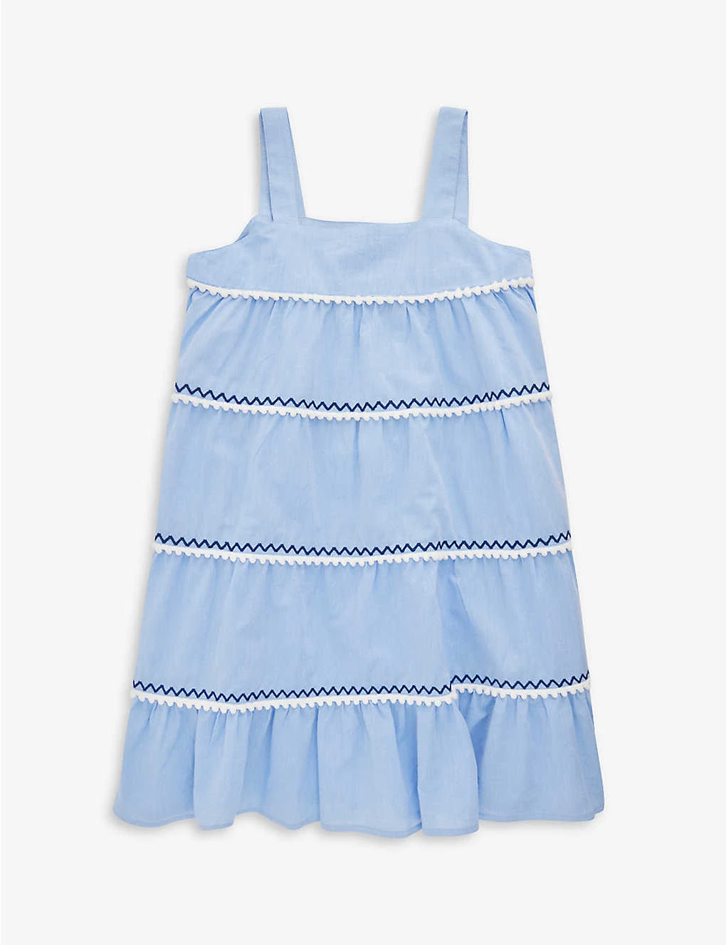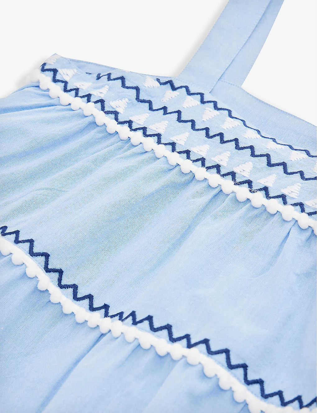 - Relaxed fit, straight across neck, shoulder straps, all-over contrast embroidery and pompom embellishments, tiered design