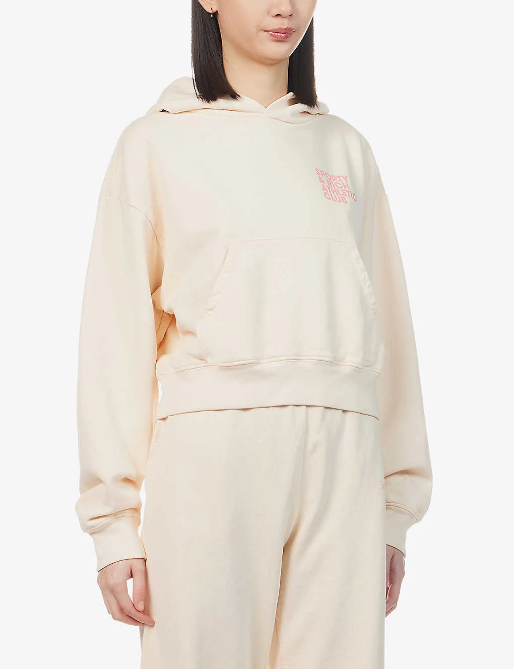 - Relaxed fit, hood, dropped shoulders, long sleeves, brand print at chest, kangaroo pocket at front, ribbed trims, cropped