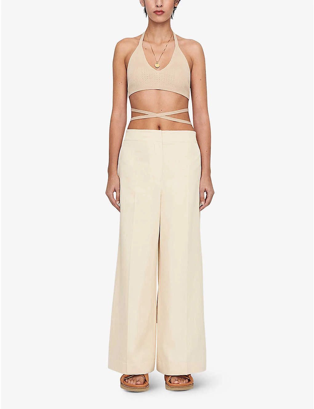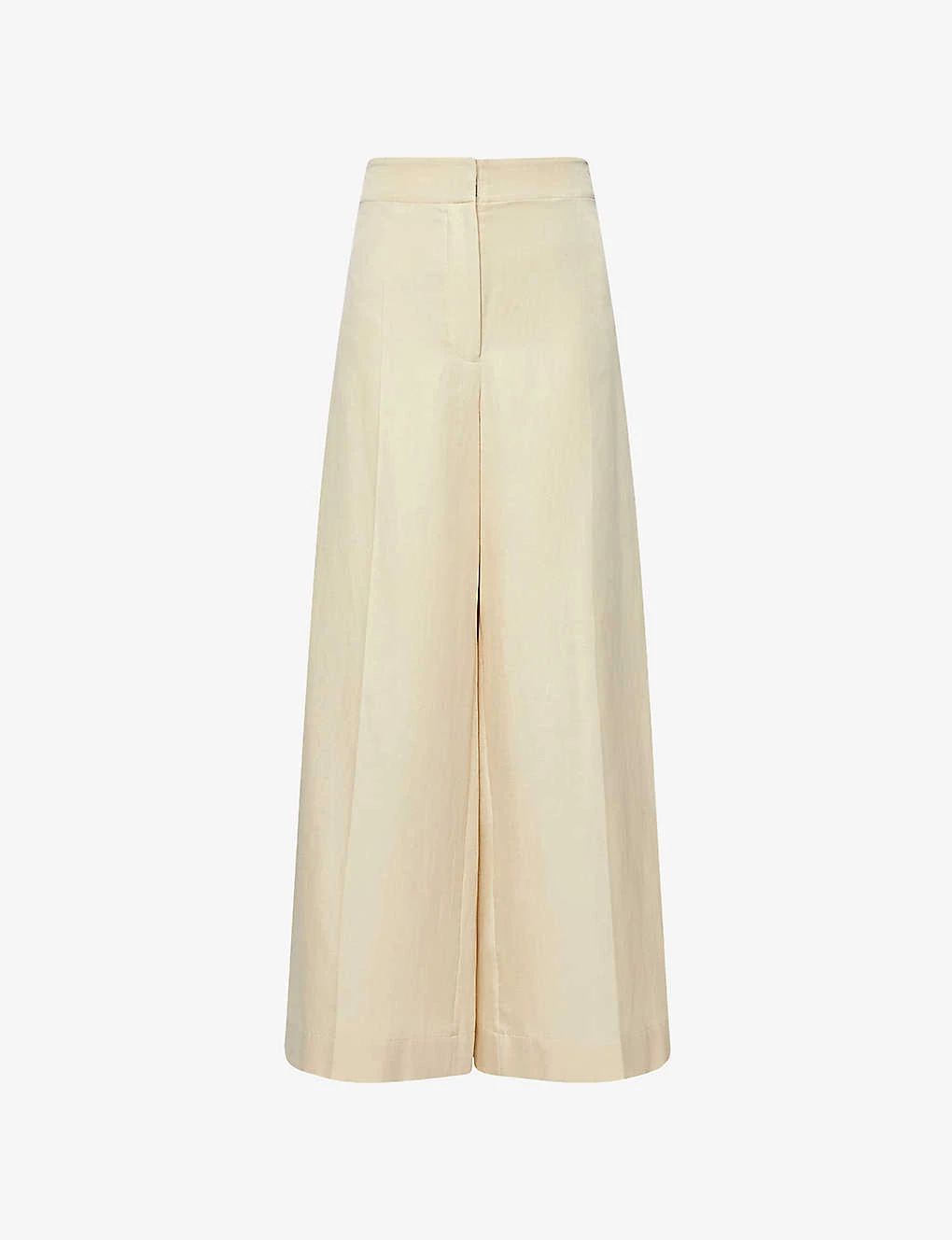 - Wide leg, mid-rise, elasticated back waistband, two side slip pockets, centre pressed creases