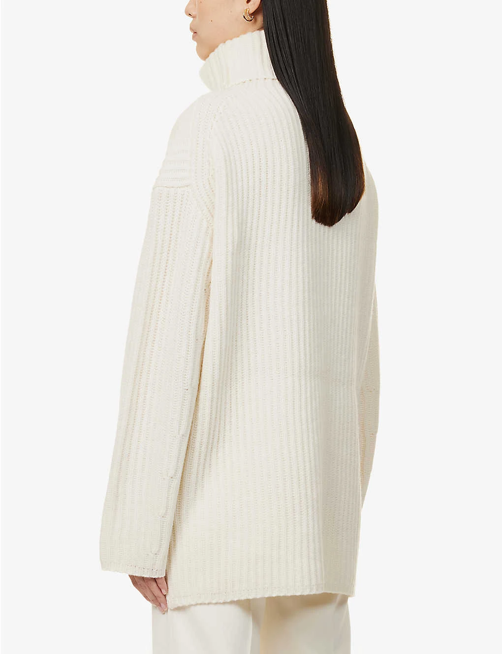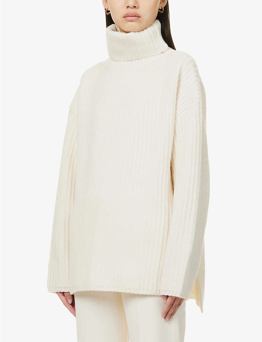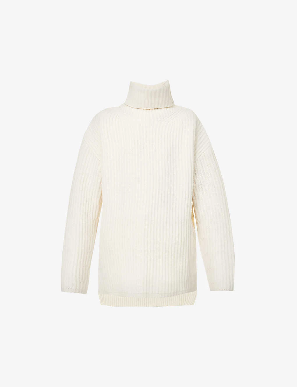 - Relaxed-fit, turtle-neck, long sleeves, dropped shoulders, ribbed trims, all-over stitched pattern