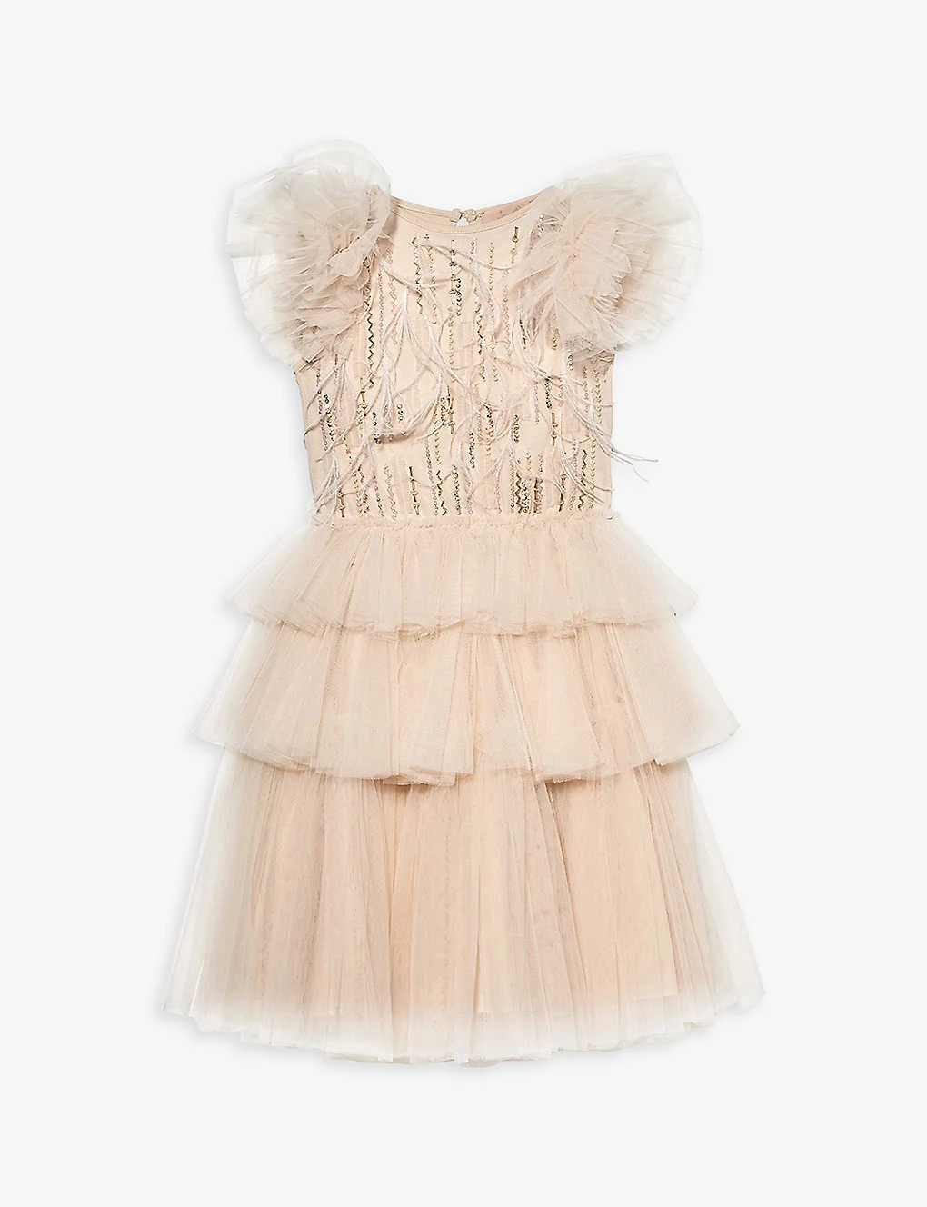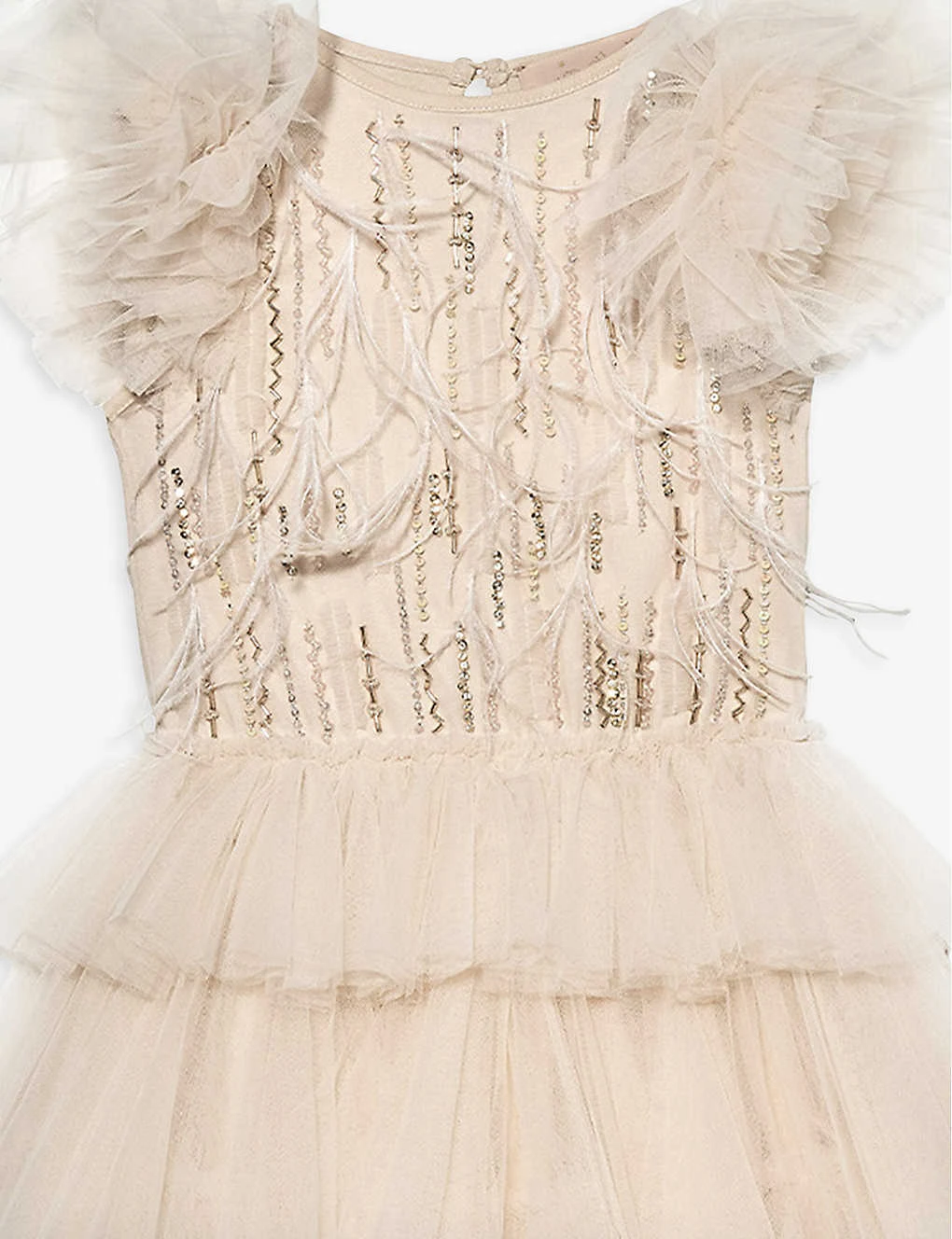- Round neck, ruffled sleeves, sequin embellished at front, feathers at front, tiered tulle skirt