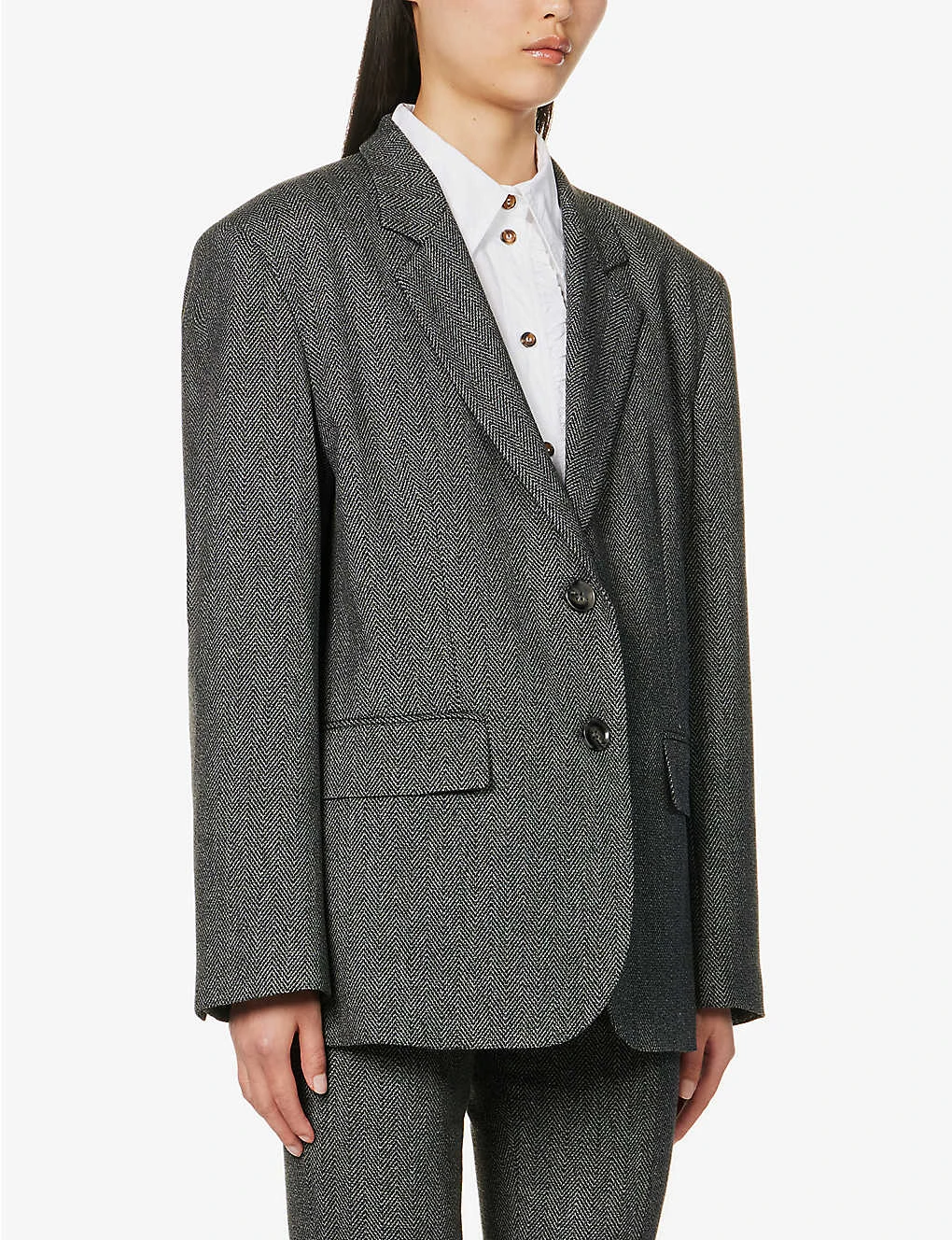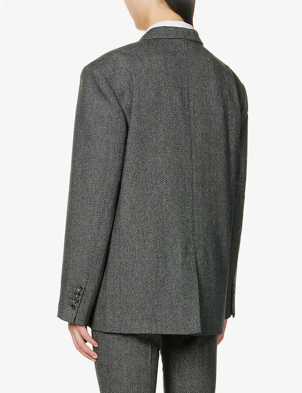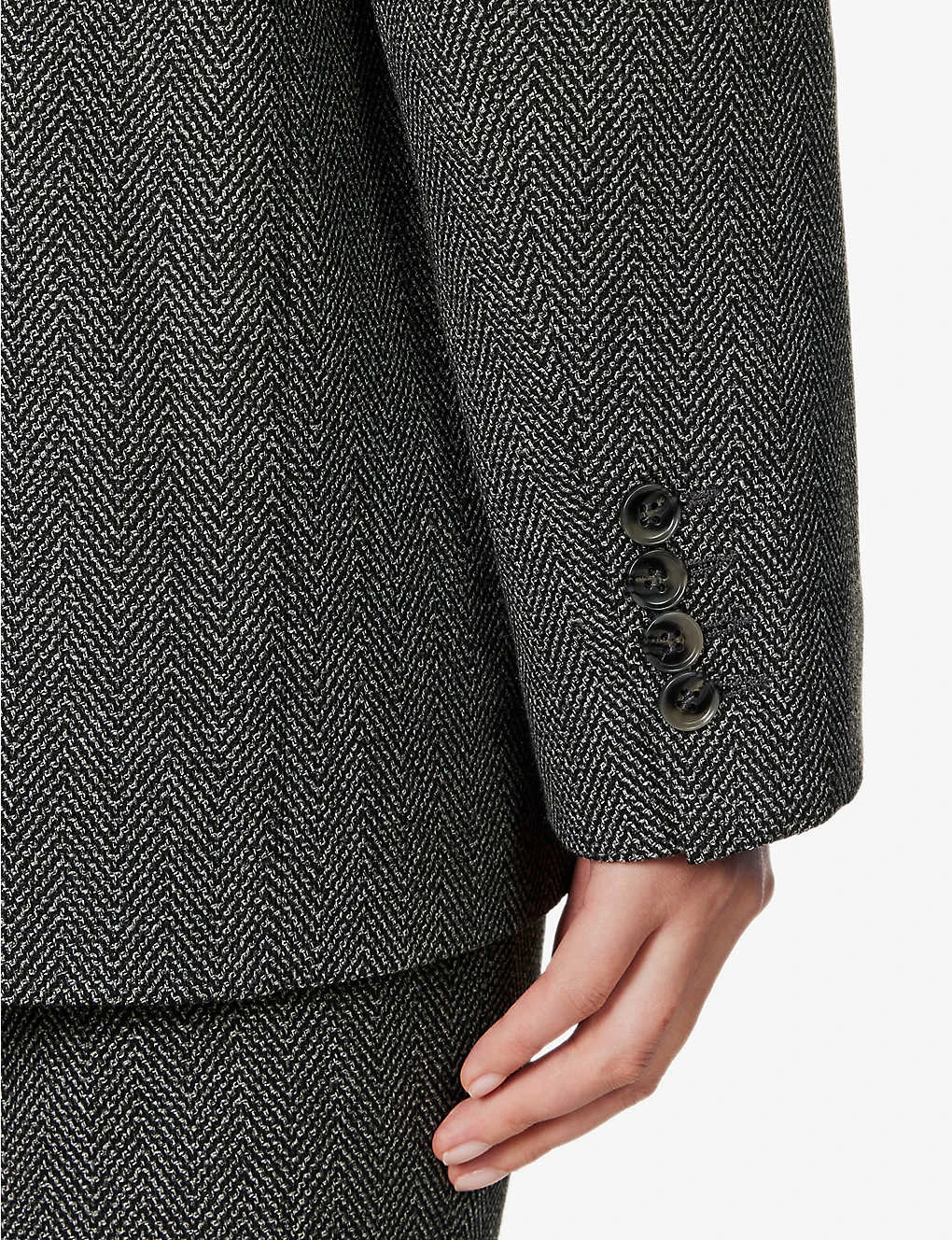 - Regular fit, single breasted, notched lapels, padded shoulders, long sleeves, buttoned sleeve hems, twp flap pockets at front, open vent at back, all-over zig-zag pattern, fully lined