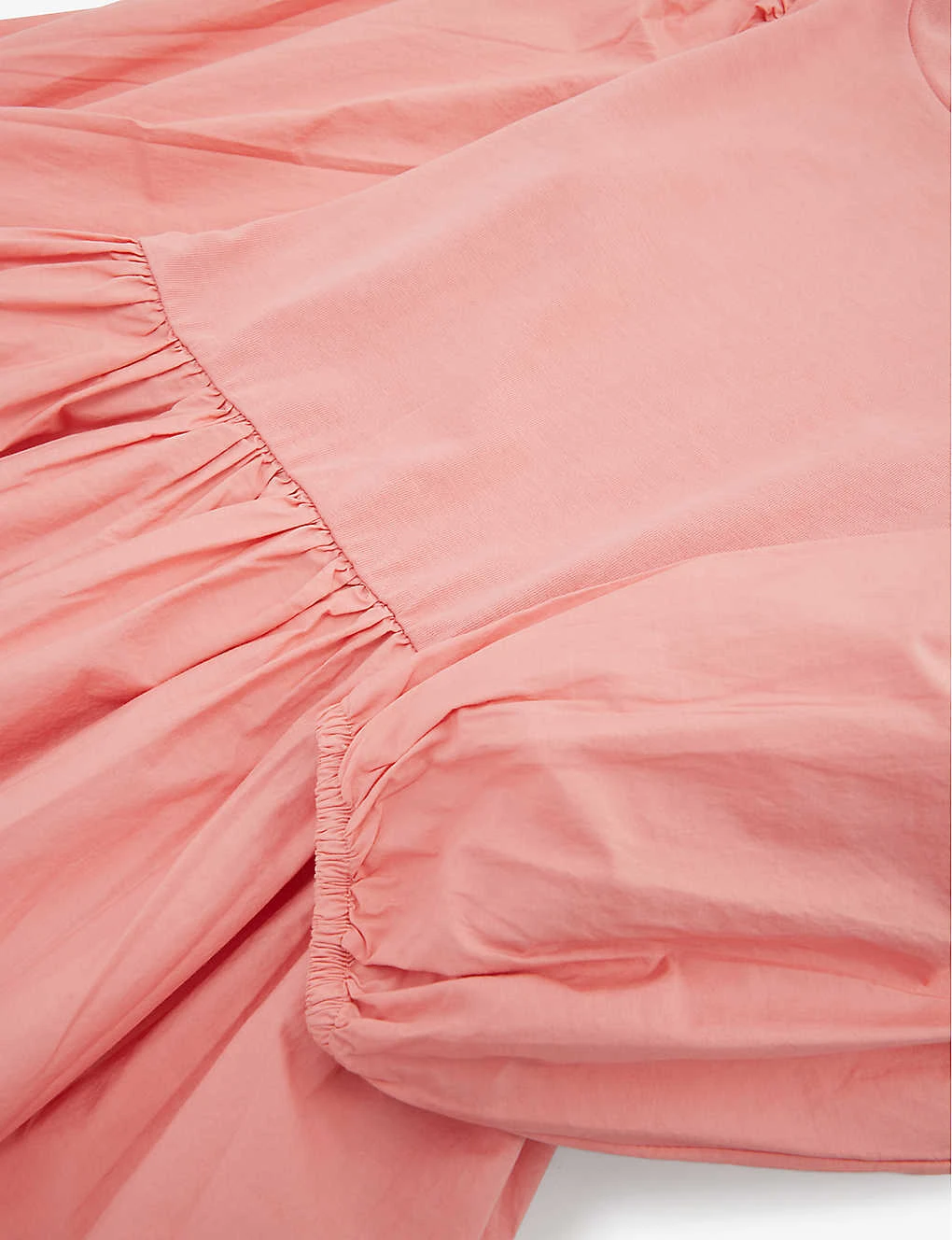 - Regular fit, round neck, ribbed trim at neck, long puff sleeves, elasticated sleeve hems, gathered at waist, flared hem