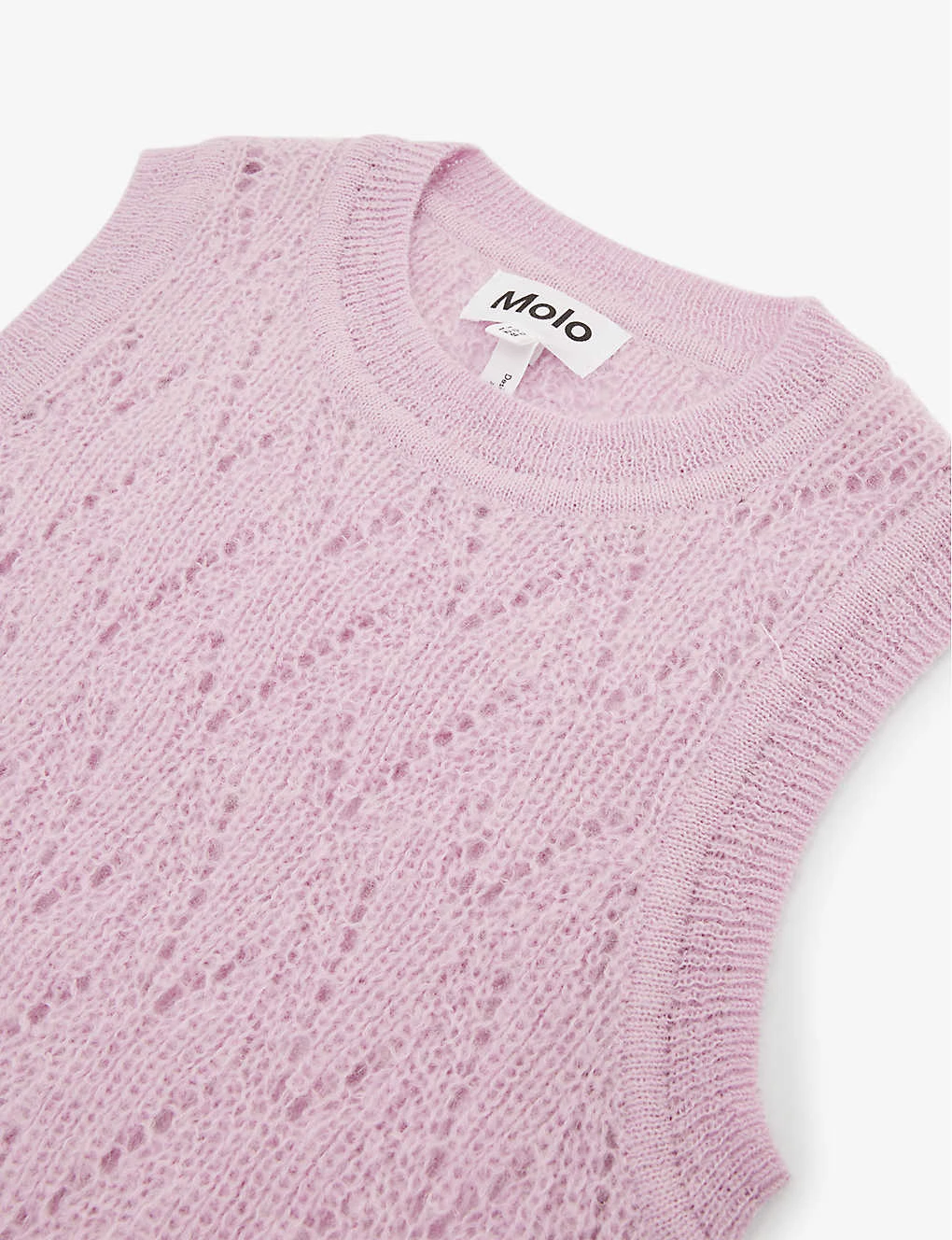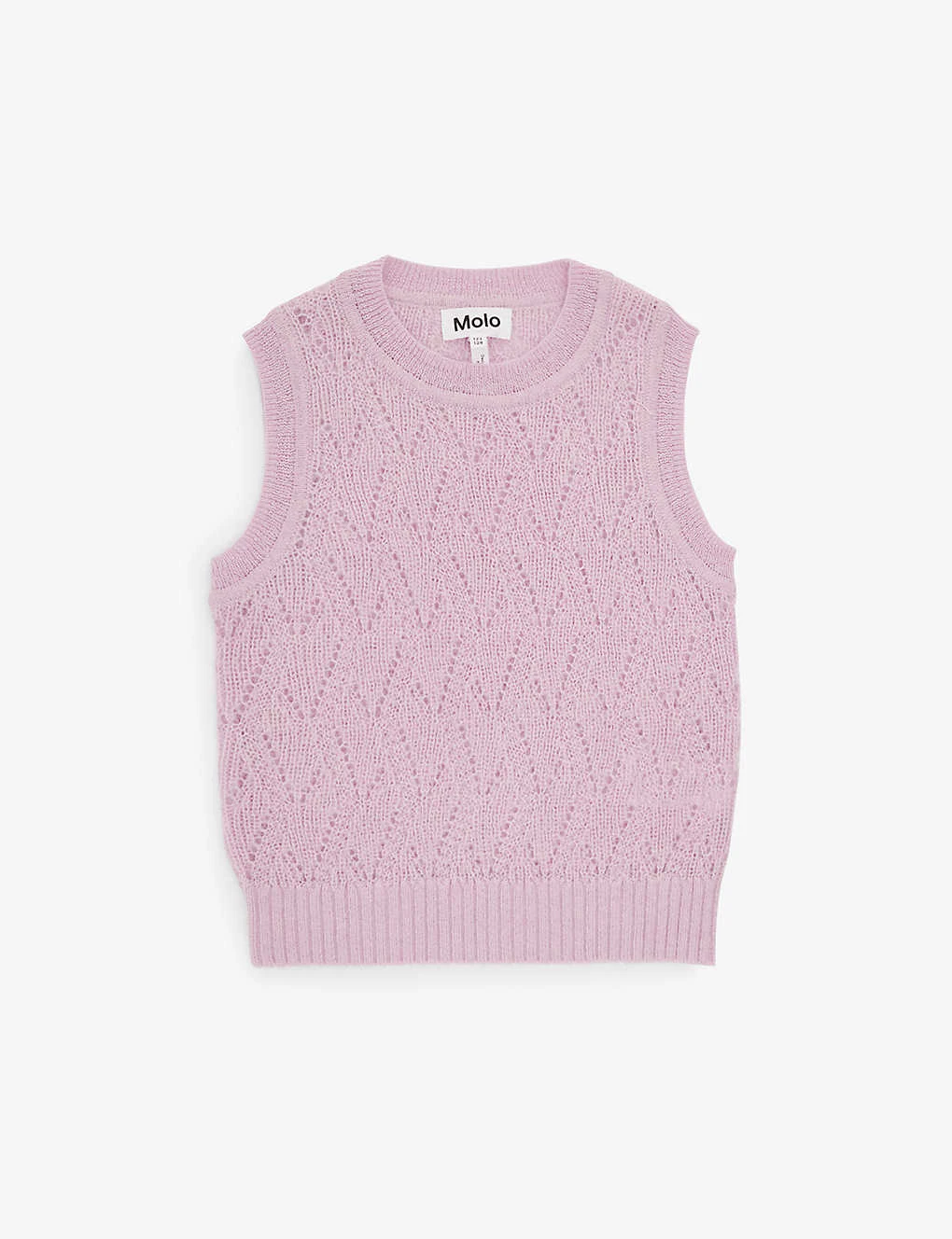 - Round neck, sleeveless, semi-sheer, all-over cut-out knit design, brand patch at side, ribbed trims
