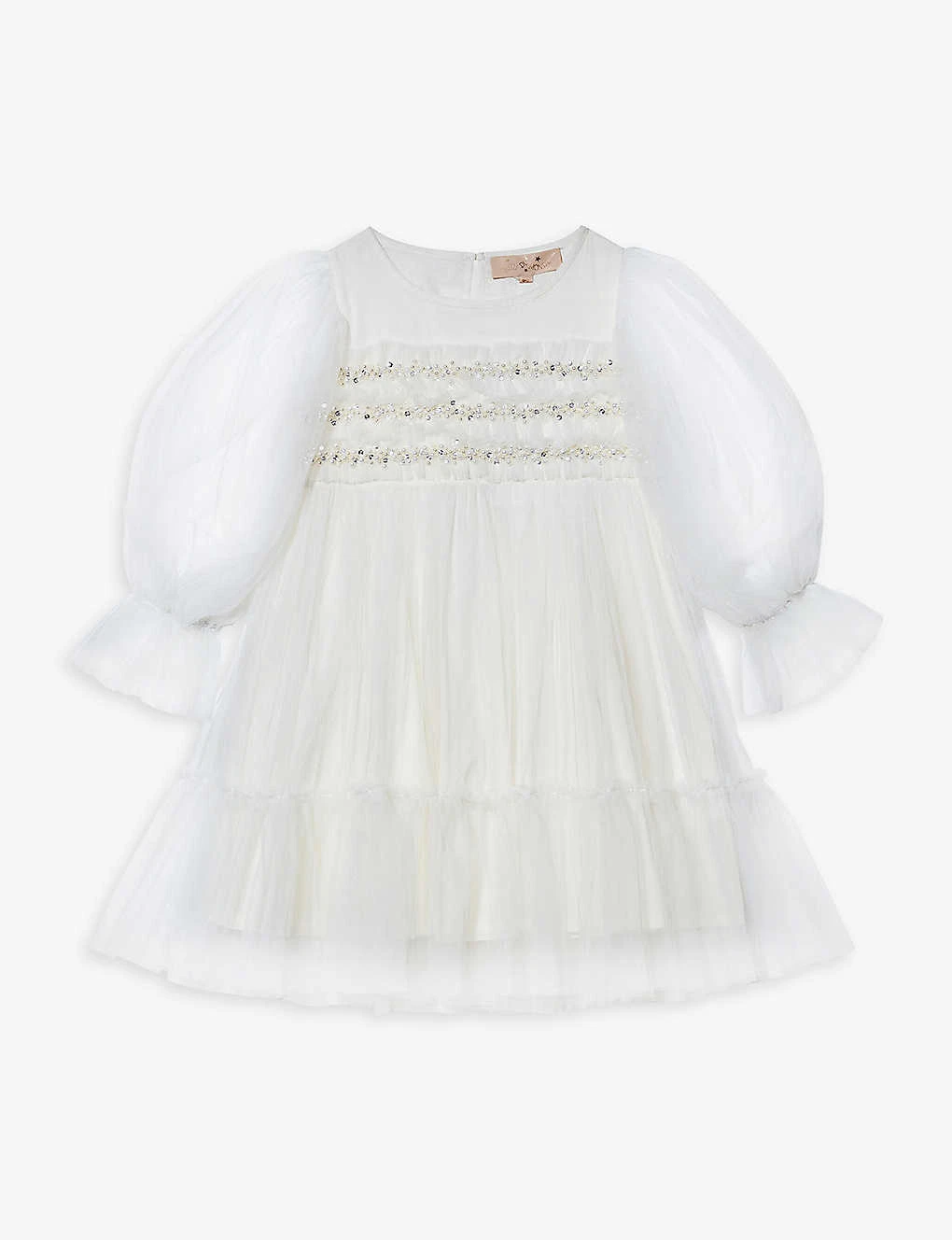 - Round neck, long puff sleeves, ruffled and crystal embellishment at bodice, flared skirt