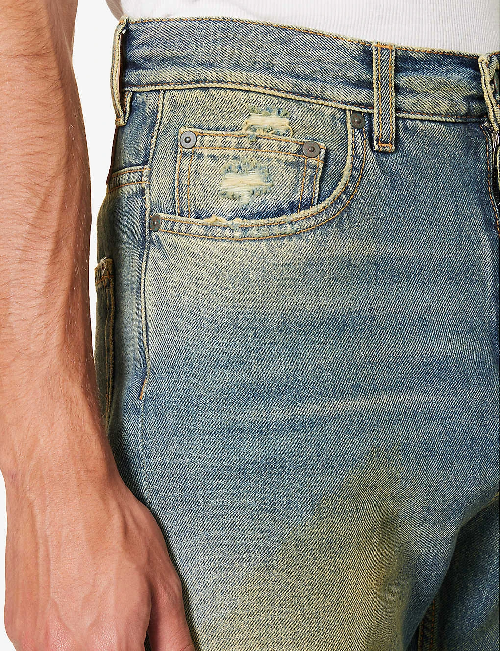 - Regular fit, mid-rise, flared leg, belt loops, five pockets, brand patch at back, branded hardware, contrast stitching, faded and distressed finish, partially lined