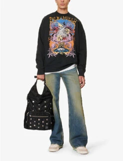 - Relaxed fit, mid-rise, dropped crotch, elasticated drawstring waistband, two slip pockets at sides, patch pocket at back, all-over graphic floral pattern