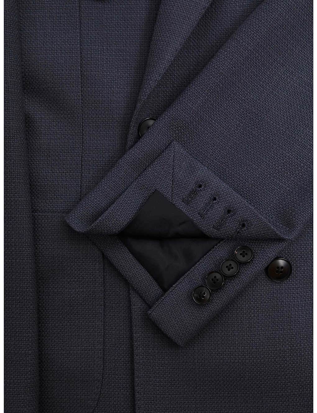 - Slim fit, peak lapels, one welt pocket at the chest, long sleeves, double-breasted silhouette, textured weave throughout