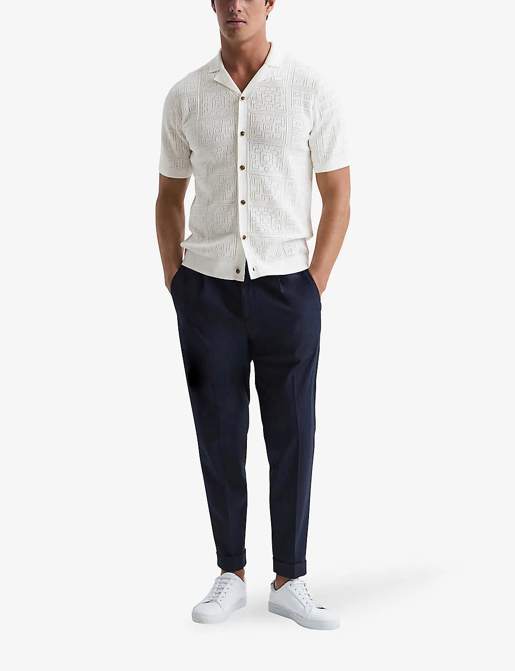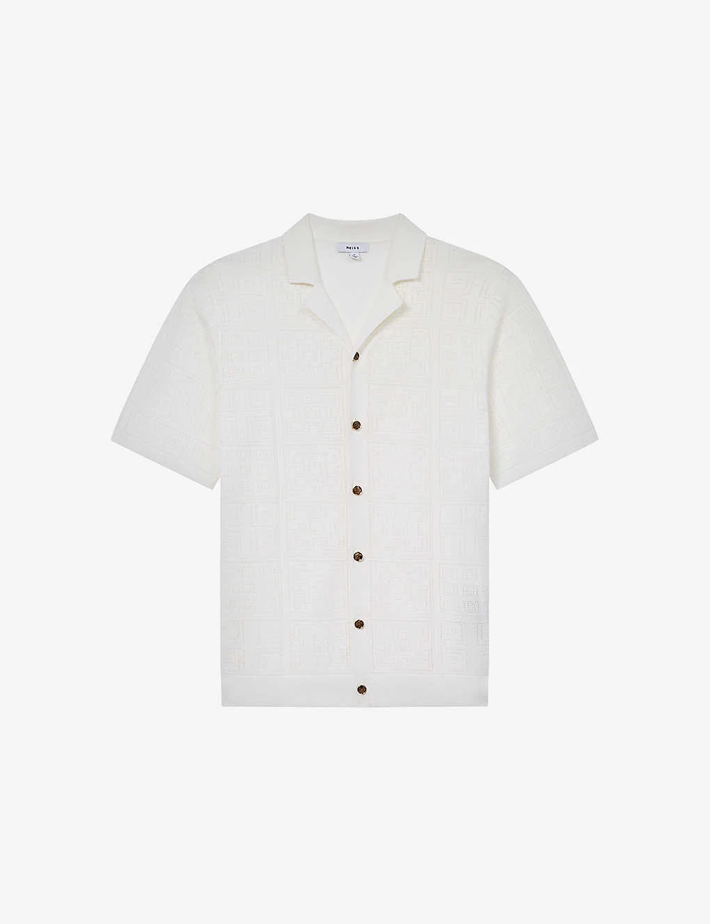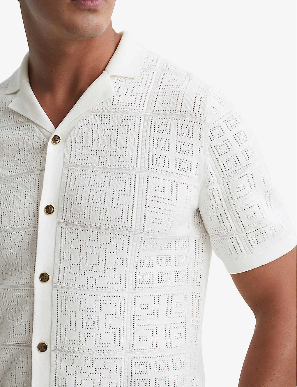 - Relaxed fit, V-neck, Cuban collar, short sleeves, all-over graphic-textured weave