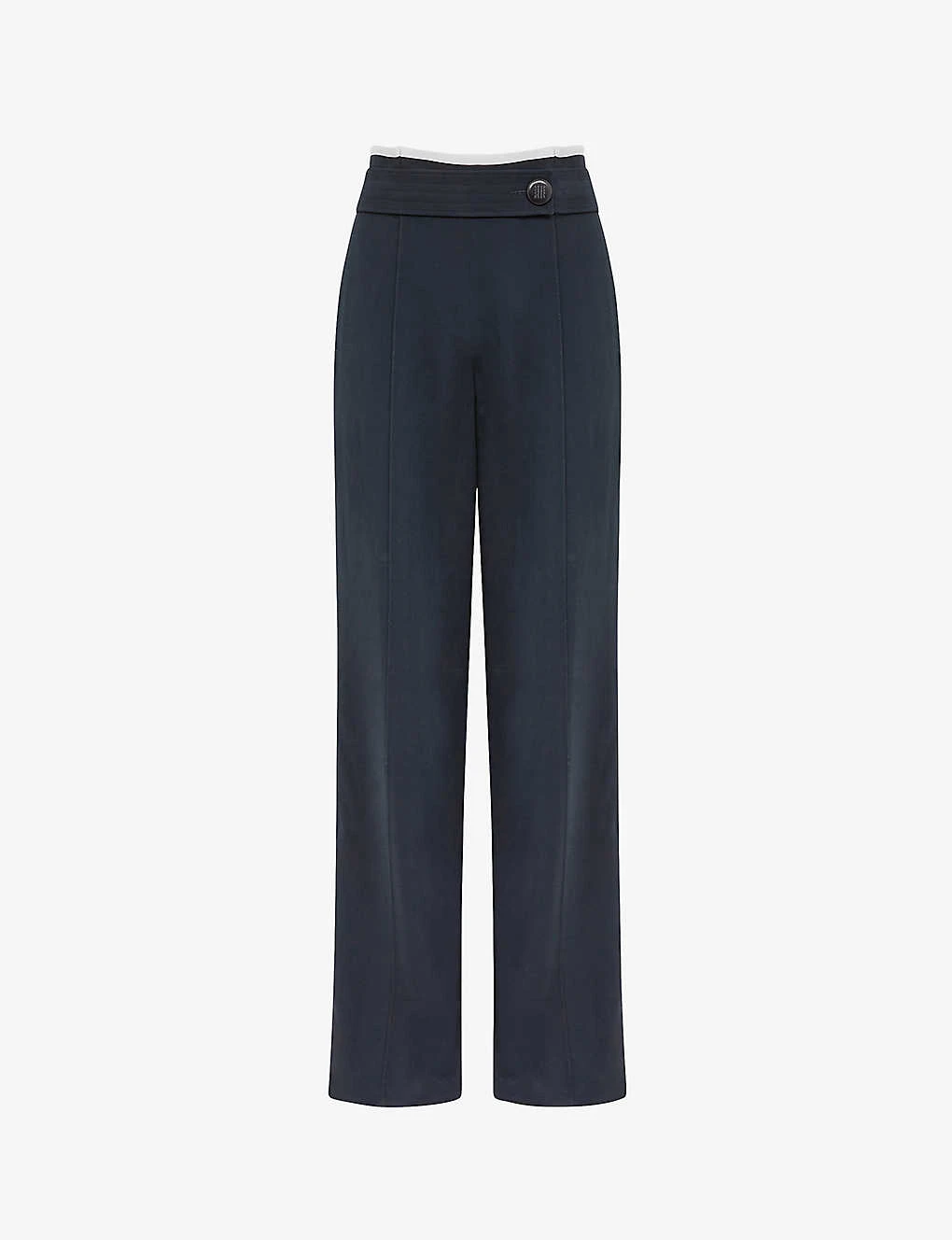 - High rise, wide-leg, button detail at the side, contrast piping along the seams