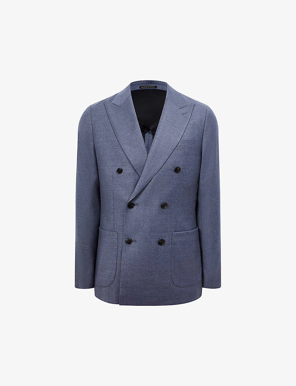 - Slim-fit, peak lapels, long sleeves, buttoned cuffs, double-breasted, textured, welt pocket at chest, patch pockets at front, double vent at back, fully lined