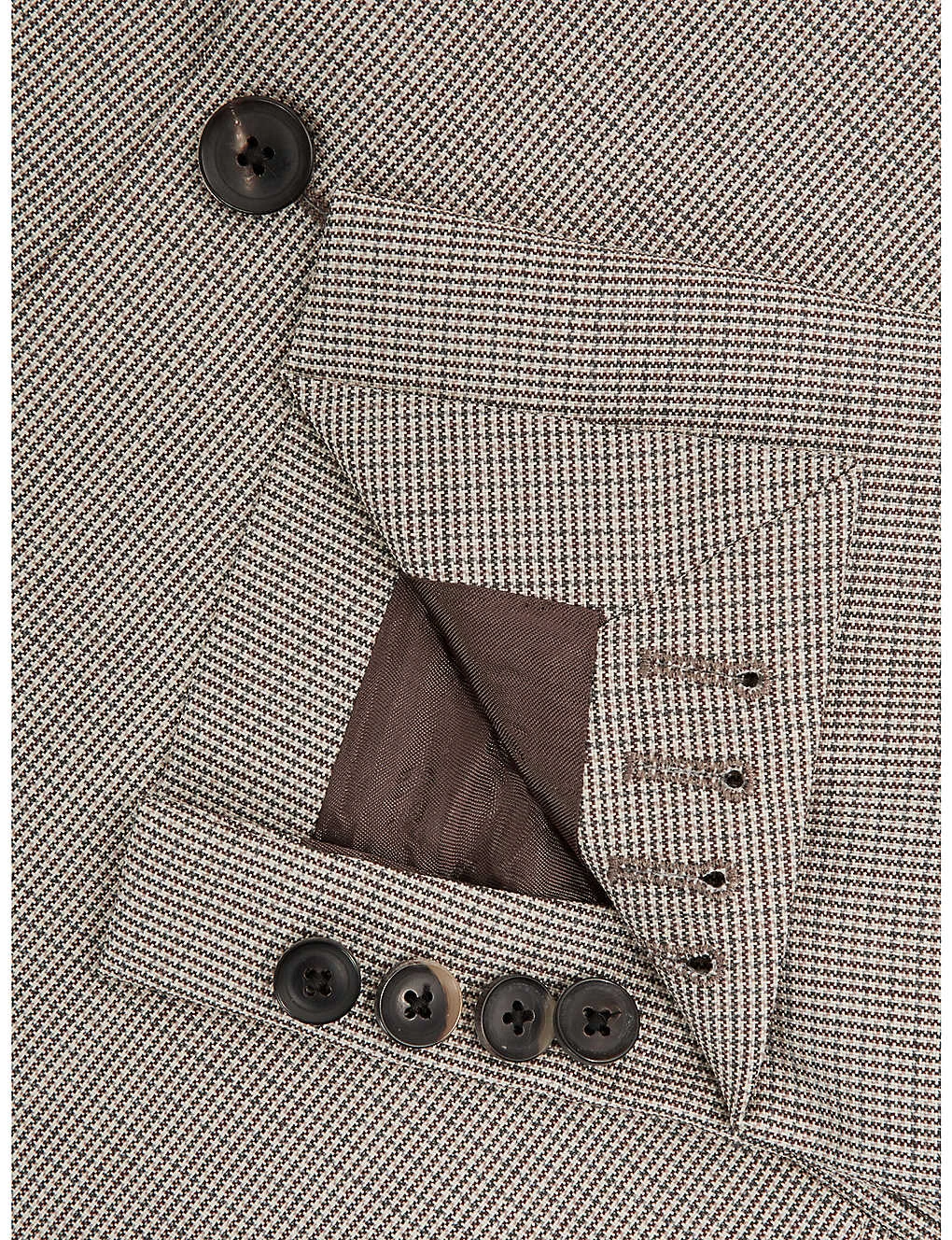 - Slim-fit, peak collar and notched lapels, single breasted, long sleeves, buttoned cuffs, all-over houndstooth pattern, darts at the front, piped pocket at chest, two jetted pockets at front, darts at the back, two vents at the side