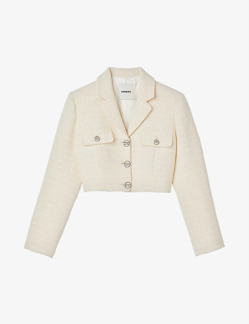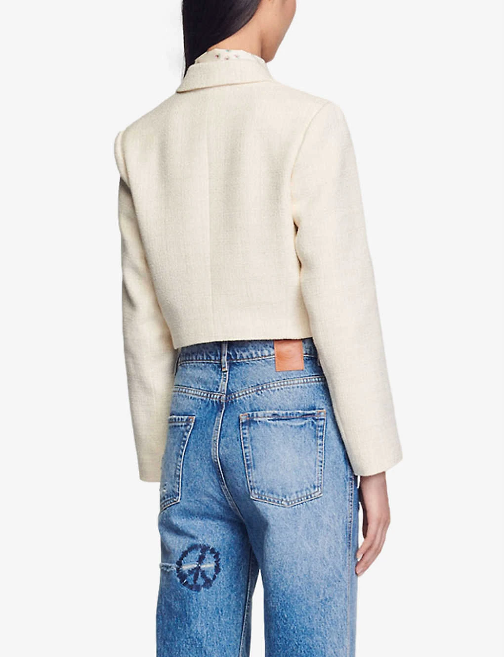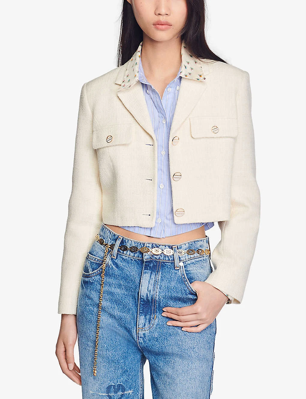 - Boxy-fit, collar, long sleeves, patch pockets at chest, branded buttons, all-over contrasting topstitching, cropped