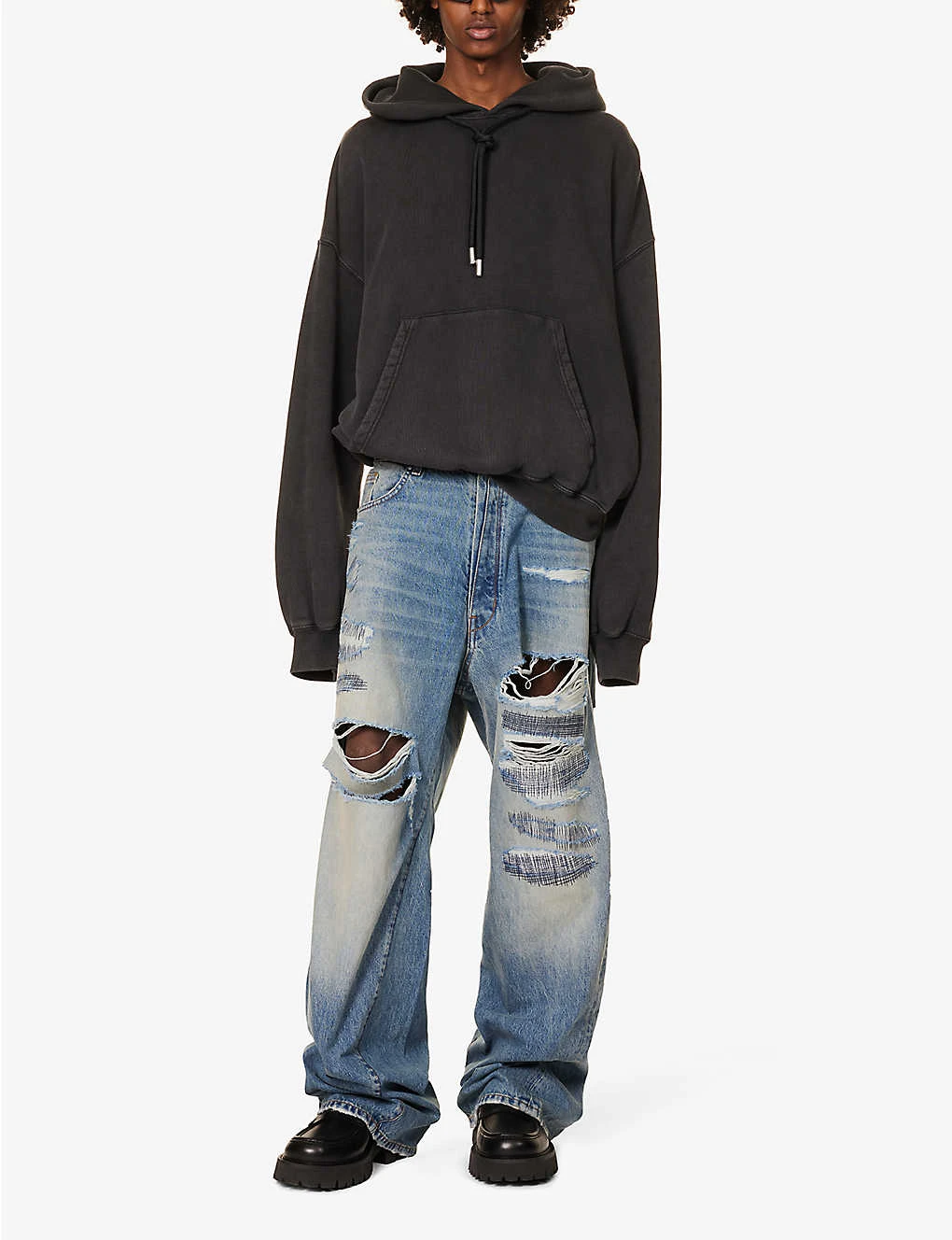 - Relaxed fit, drawstring hood, dropped shoulders, long sleeves, kangaroo pocket at front, graphic brand print at back, faded wash, ribbed trims