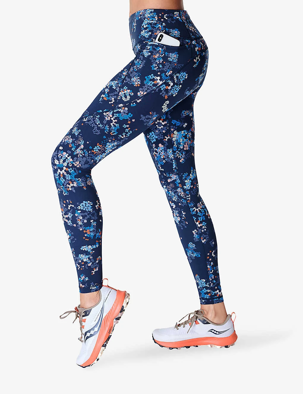 - High rise, elasticated waistband, concealed zip-fastening slip pocket at back waistband, reflective brand print at back
