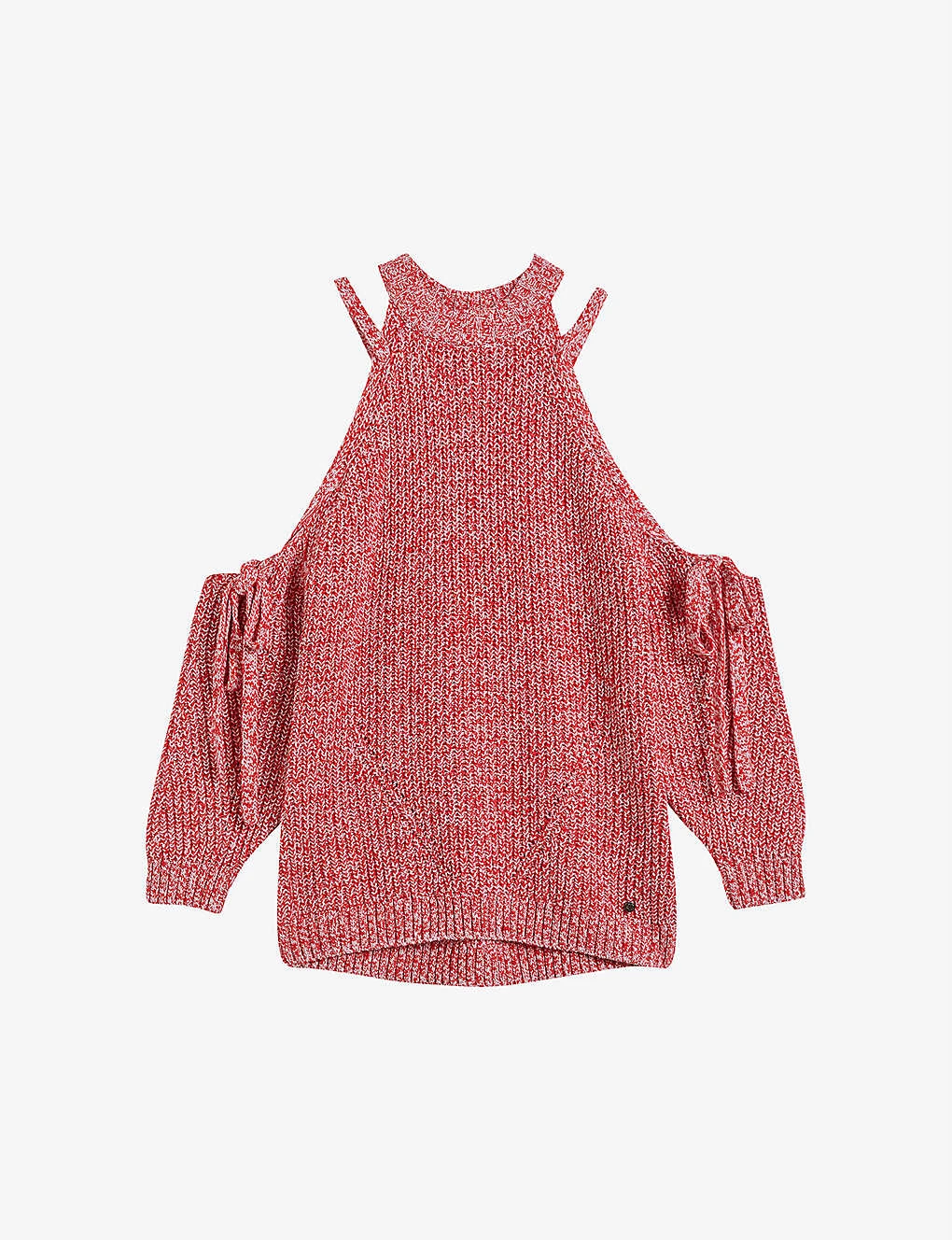 - Regular fit, shoulder cut-out, bow appliqués at elbows, chunky knit, ribbed trims, speckled weave