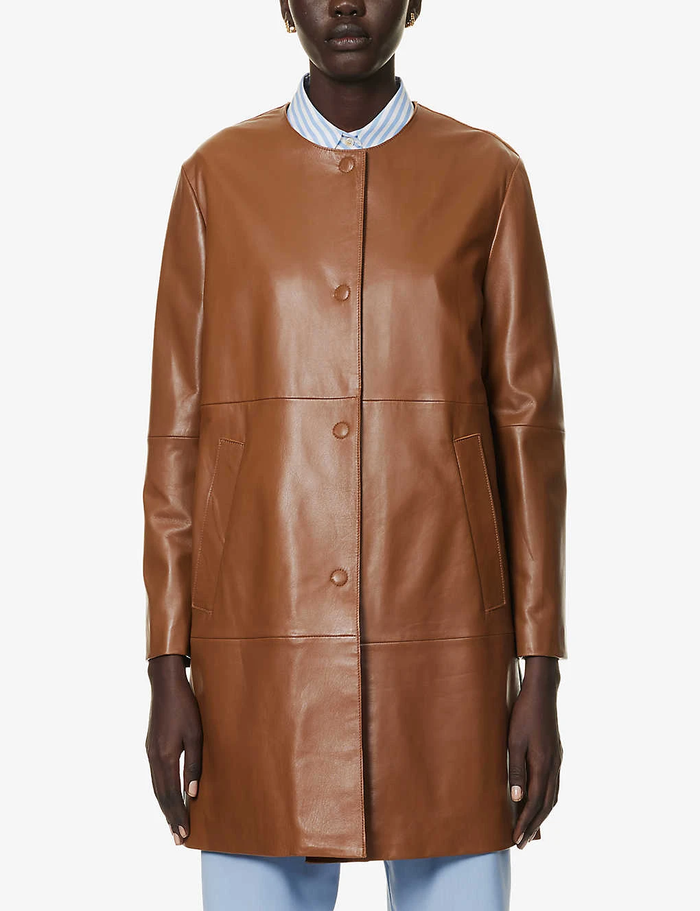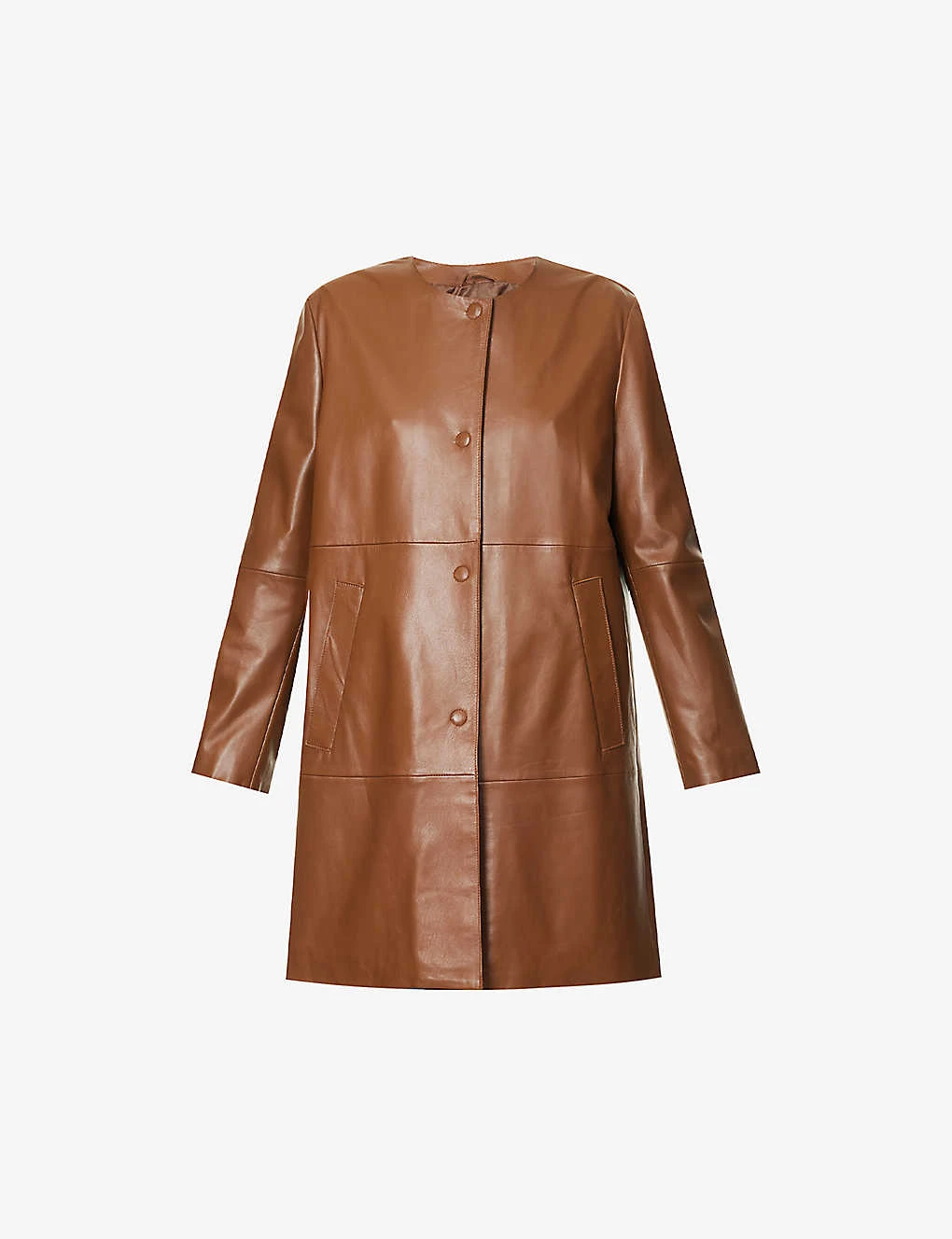 - Relaxed fit, H-line shape, round neck, long sleeves, straight cuffs, two welt pockets at front, [panels, all over smooth leather, fully lined, single vent