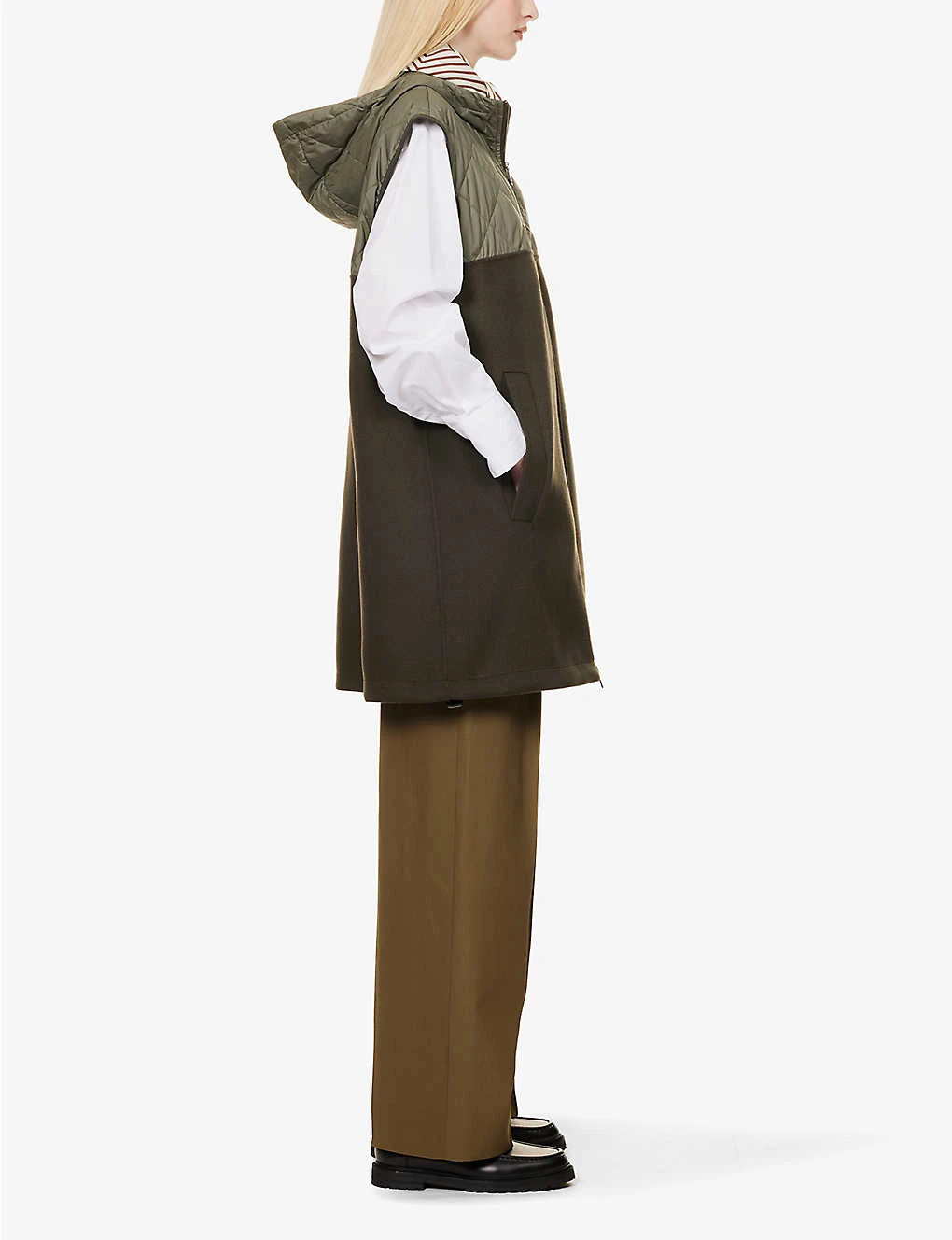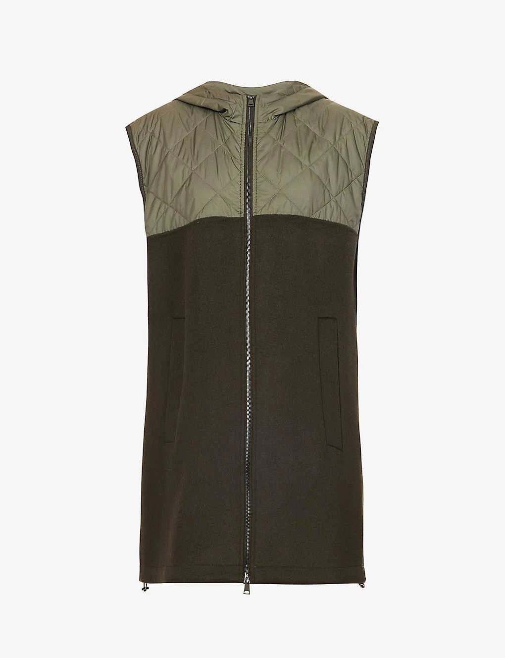 - Regular fit, funnel neck, hood, sleeveless, contrast fleece lower half, two angled slip pockets at front, silver-toned hardware