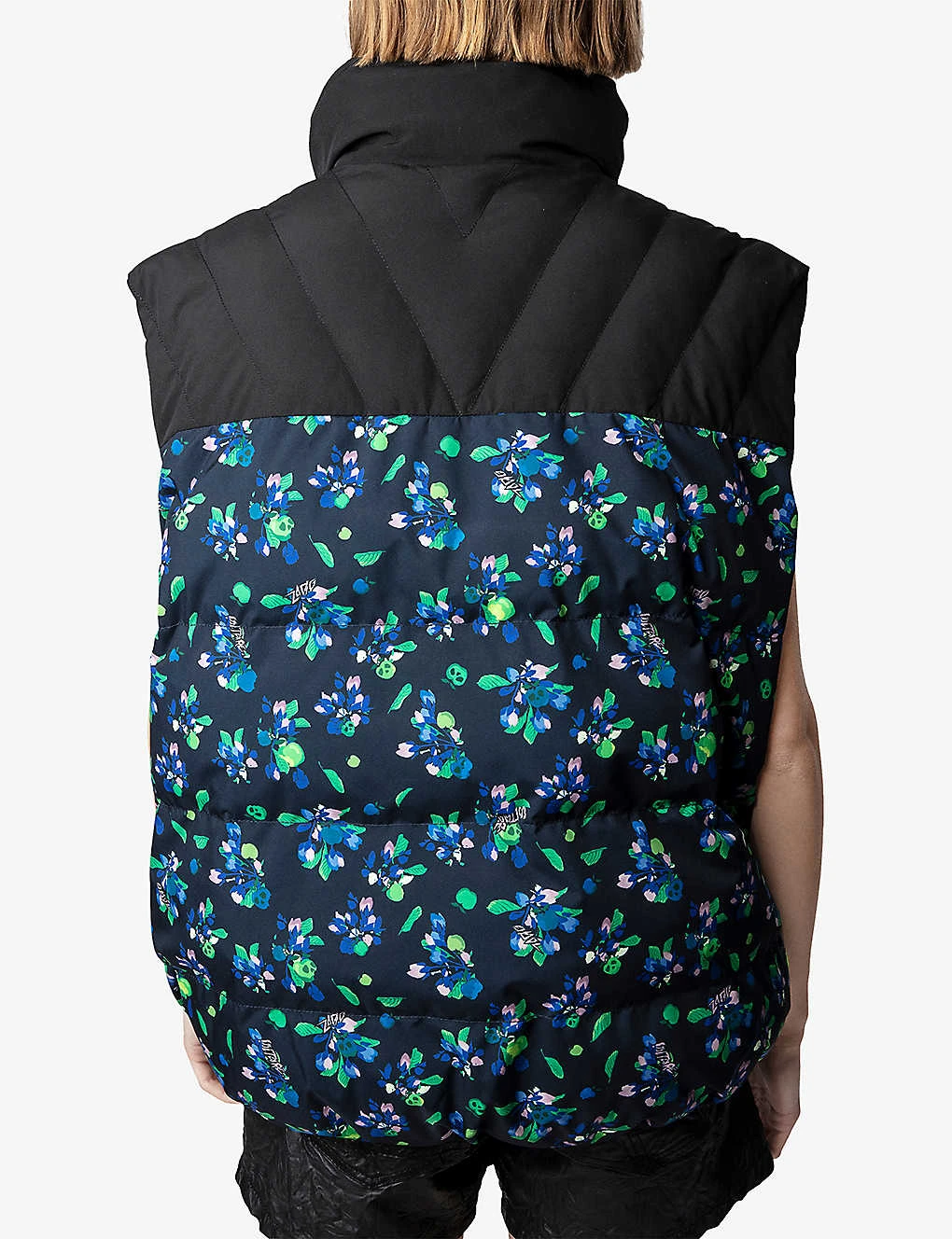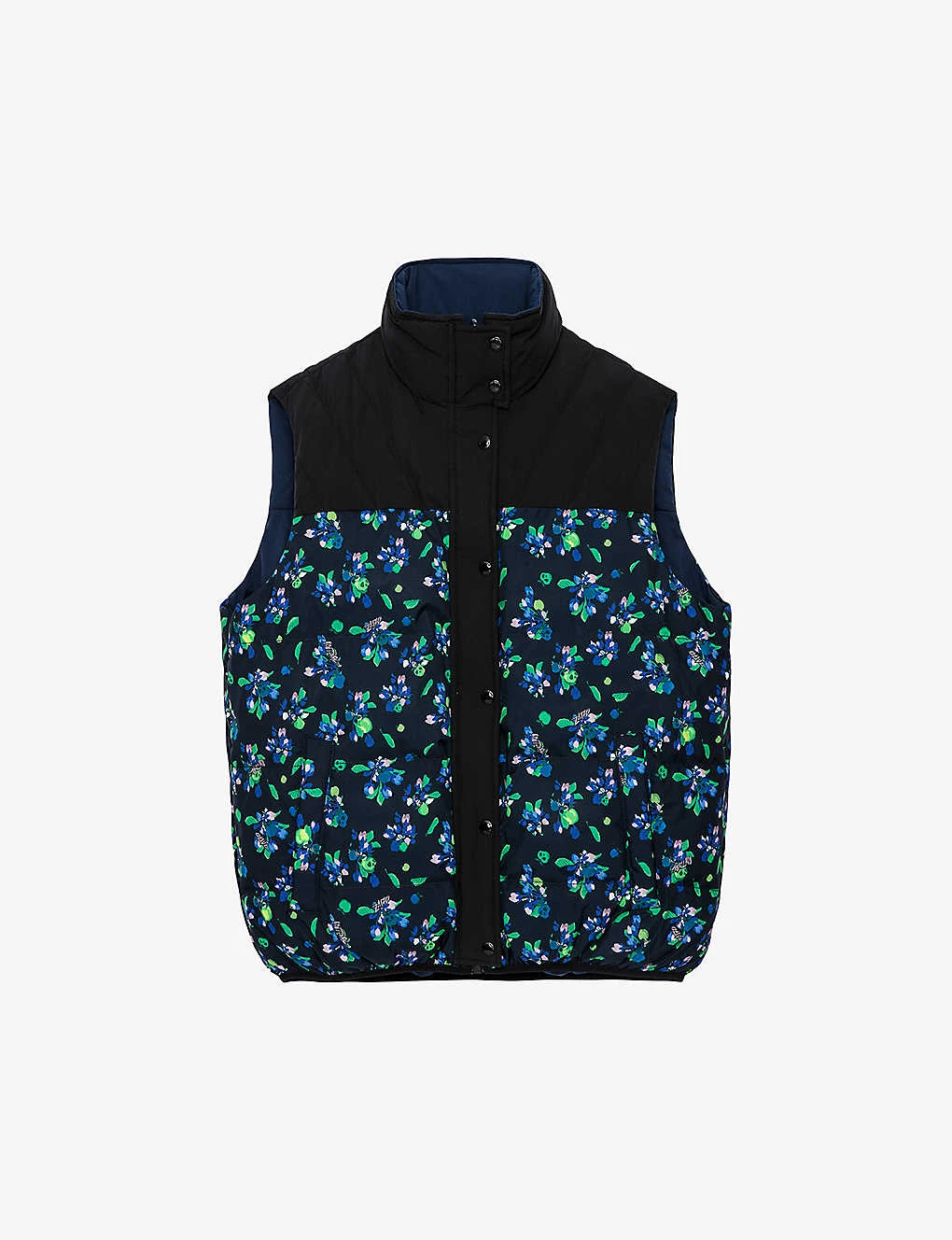 - High neck, sleeveless, all-over quilted diamond pattern, floral print at front and back, reversible option, two slip pockets at side